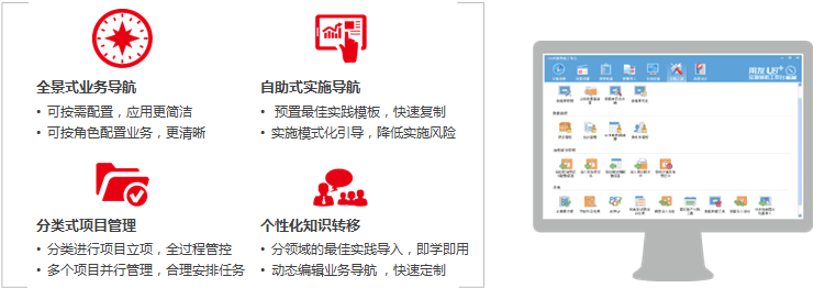 U8+可(kě)以為(wèi)您提供簡單适用(yòng)、快(kuài)速見(jiàn)效、↔∞∑ 低(dī)成本的(de)實施工(gōng)具,全面提升實施效能(néng)。